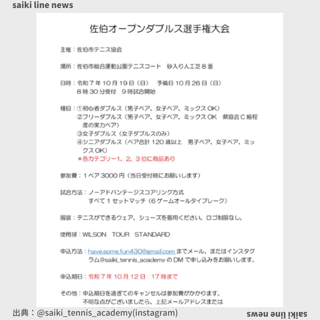 令和7年10月19日、佐伯市総合運動公園テニスコートにて佐伯オープンダブルス選手権大会を開催します。