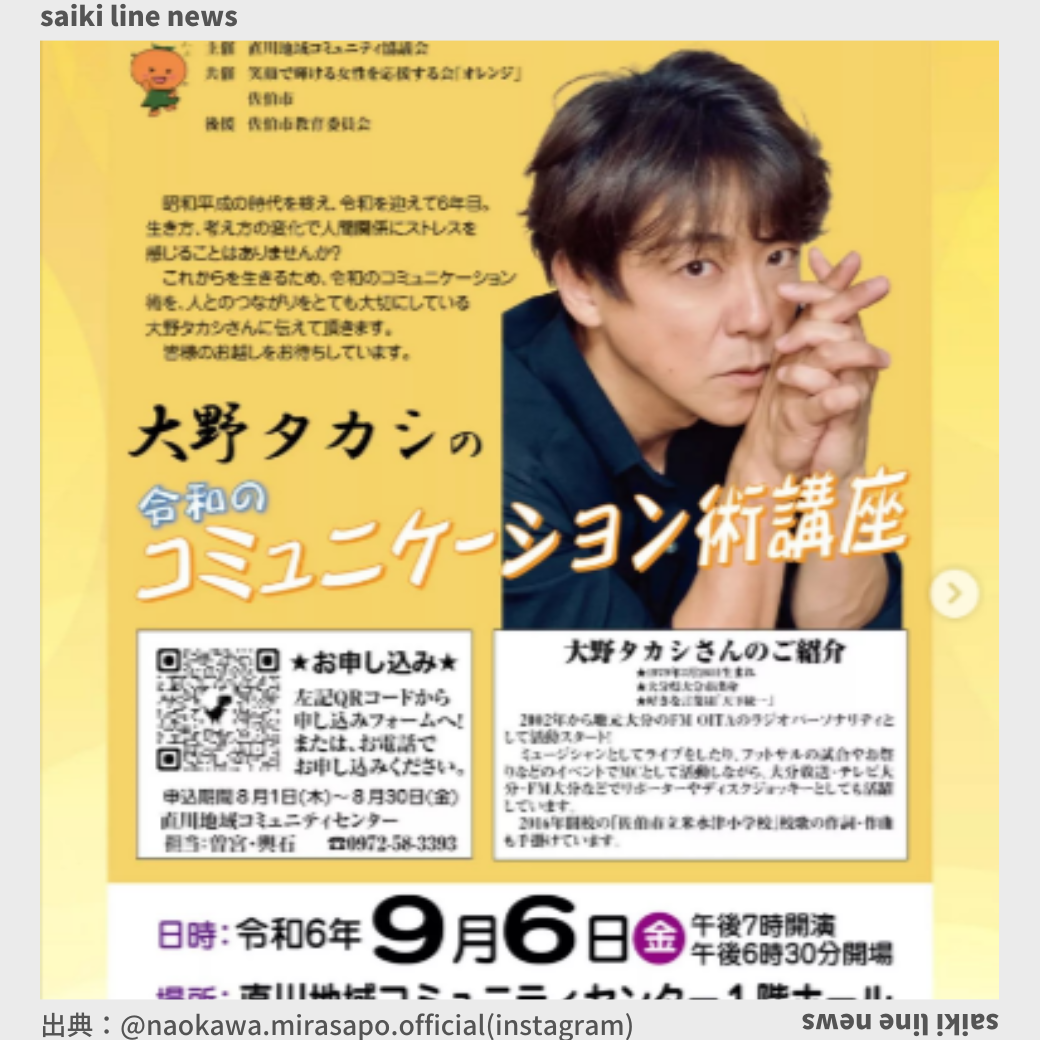 📣大野タカシさんの講座のお知らせ🎶 タレントやミュージシャンなど 多彩な才能を持つ˗ˏˋ大野タカシˎˊ˗さんが 大分県佐伯市直川にやってきます!🤩 大野タカシさんから、今の時代を生き抜くために 必要なスキルを楽しく学びま ...