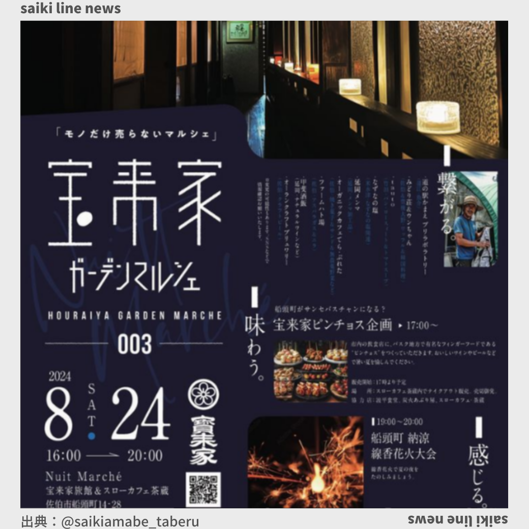 船頭町の宝来家旅館にてガーデンマルシェを開催します。 日時:2024年8月24日 16:00〜20:00 夏のマルシェは、夕方から夜にかけて少しでも涼しく感じられたらと思っております。熱中症対策は十分とってお越しください ...