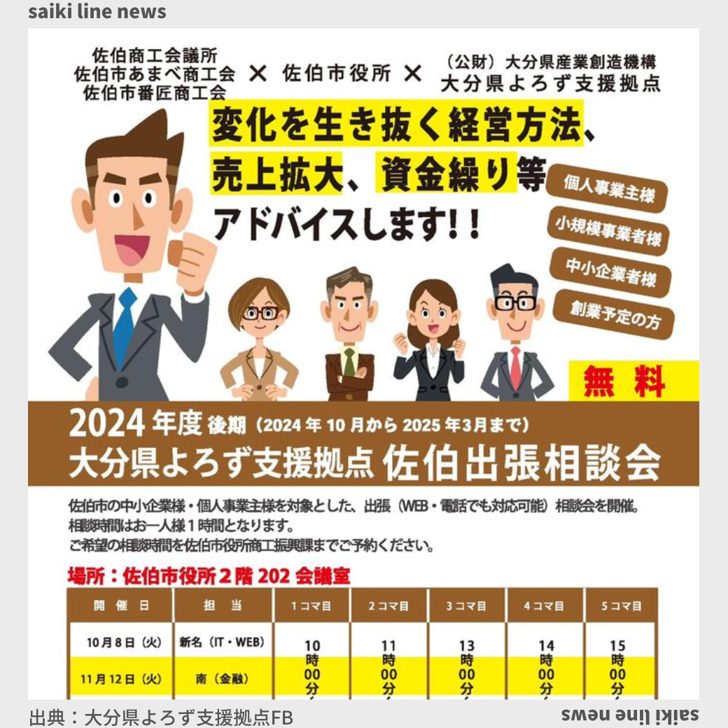 佐伯市の中小企業様・個人事業主様、創業希望者様を対象とした、出張(WEB・電話でも対応可能)相談会を開催いたします。 担当:堀(IT・WEB) 料金:無料 場所:佐伯市役所(佐伯市中村南町1−1)2階202会議室 日時: ...