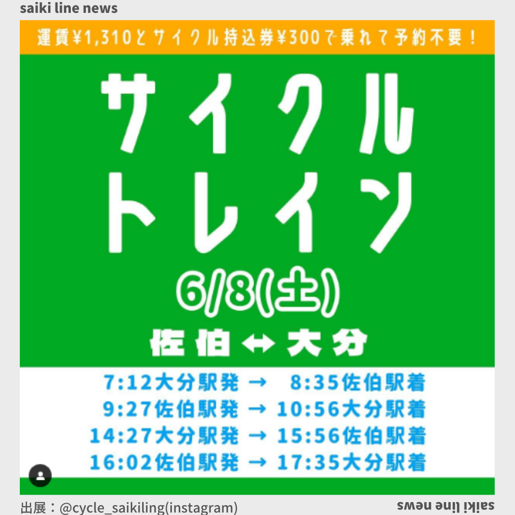 🚃6月サイクルトレイン🚃 サイクルトレインは自転車を輪行バックにいれることなく そのまま列車に積むことができる超便利な乗り物🥹‼️ 佐伯を走ってみたいけど遠いからなかなか行けないなぁ〜… という方にはもってこい🌈🤝 大分 ...