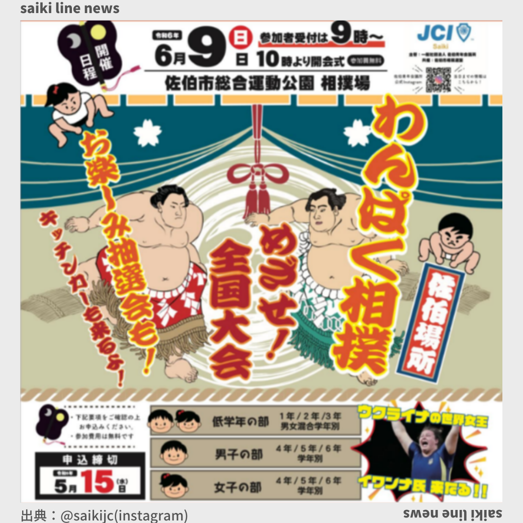 6/9 わんぱく相撲 さいき場所 募集まであと10日弱となりました! 小学生のみなさん わんぱく力士に挑戦してみませんか? 参加者には抽選会もあります!