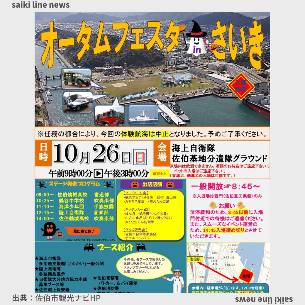 サマーフェスタ in さいき が秋にかわりました 毎年7月に開催していた「サマーフェスタinさいき」が、今年から秋開催の「オータムフェスタinさいき」に変わりました! * 任務の都合により、今回の体験航海は中止となりまし ...