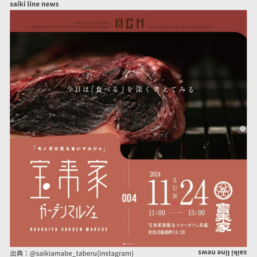 宝来家ガーデンマルシェ004 ~今日は“食べる”を深く考えてみる~ □日時 2024年11月24日(日)11時〜15時 □場所 佐伯市船頭町14-28 宝来家旅館&スローカフェ茶蔵 ※駐車場はございません。大手前 ...