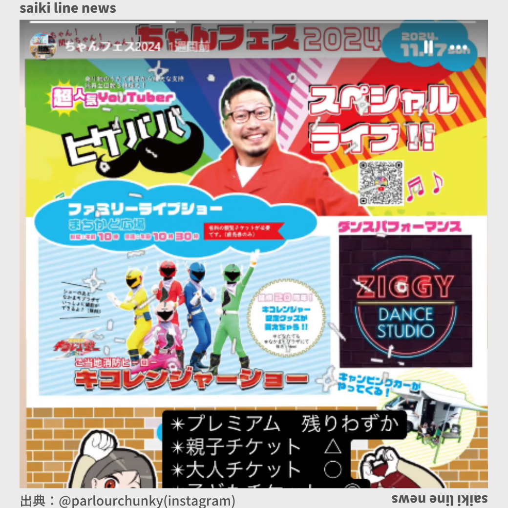 ちゃんフェス2024//2024.11.17(sun) 今回はSpecialゲストに はたらく車の歌などで子どもに超超人気のYouTuber ☆ヒゲパパさん そして、佐伯の消防ヒーロー ☆キコレンジャー かわいい!かっこ ...