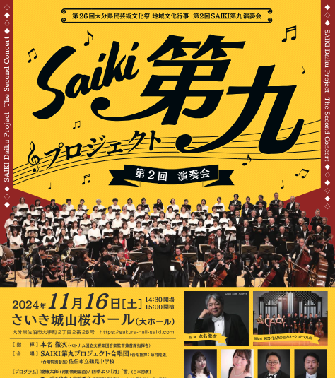 第26回大分県民芸術文化祭 地域文化行事 第2階SAIKI第九演奏会 【指 揮】本名 徹次〈ベトナム国立交響楽団音楽監督兼首席指揮者〉 【合 唱】SAIKI第九プロジェクト合唱団〈合唱指揮:菊村隆史〉 〈合唱特別参加〉佐 ...