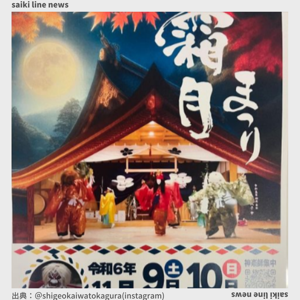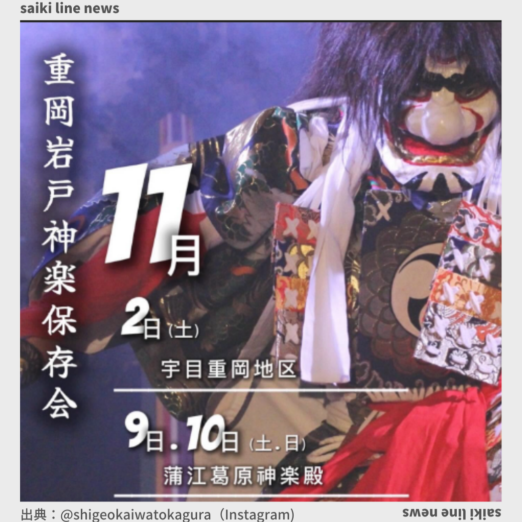 気づけばもう11月、お鍋が美味しい時期がやってきましたね🍲 - 11月9日(土)~10(日)、佐伯市蒲江の葛原神楽殿で開催される「霜月まつり」で神楽を奉納させていただきます! 葛原神楽保存会様との共演です✨️ 9日は夕方 ...
