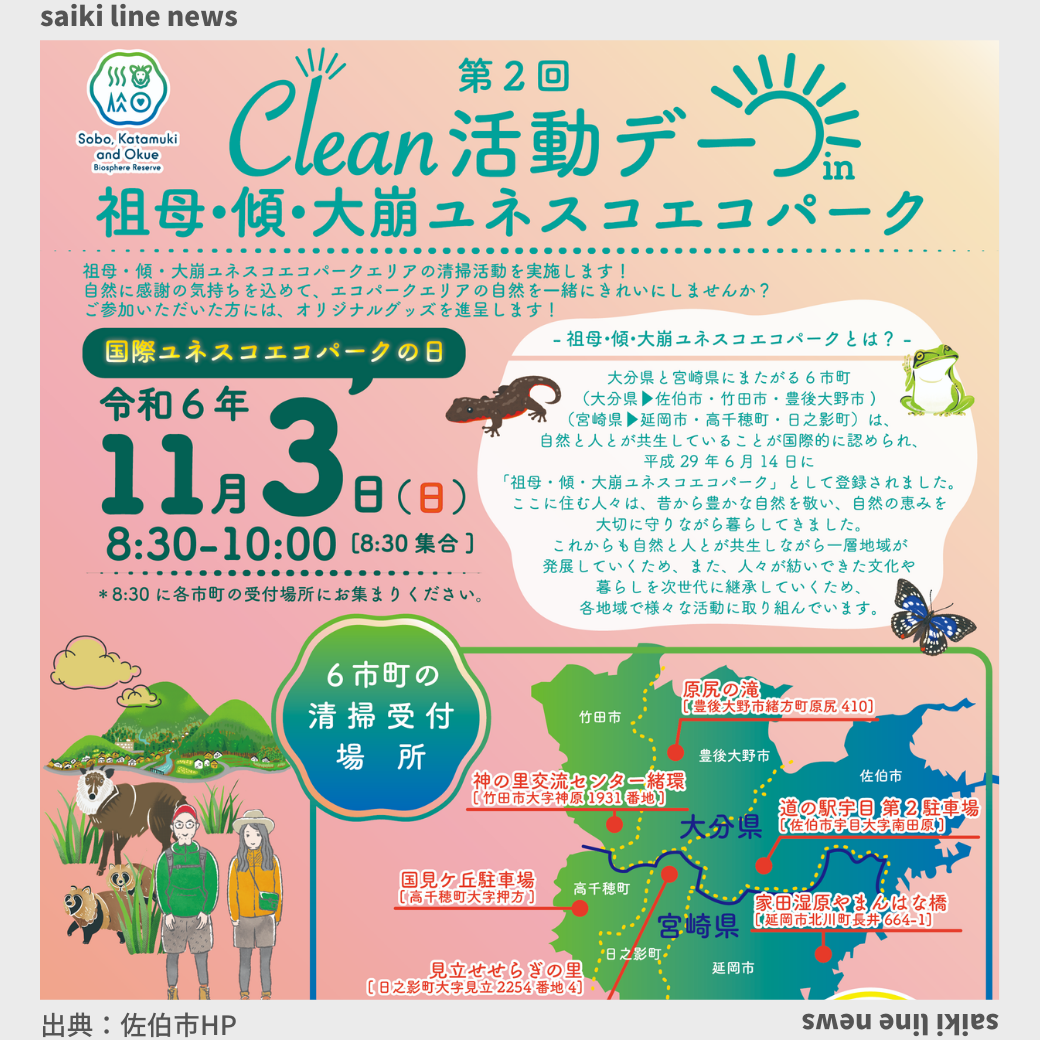 11月3日(日曜日)に祖母・傾・大崩ユネスコエコパークとして登録されている6市町(大分県:佐伯市、竹田市、豊後大野市 /宮崎県:延岡市、高千穂町、日之影町)で 一斉に清掃活動を行います。 11月3日は「国際ユネスコエコパ ...
