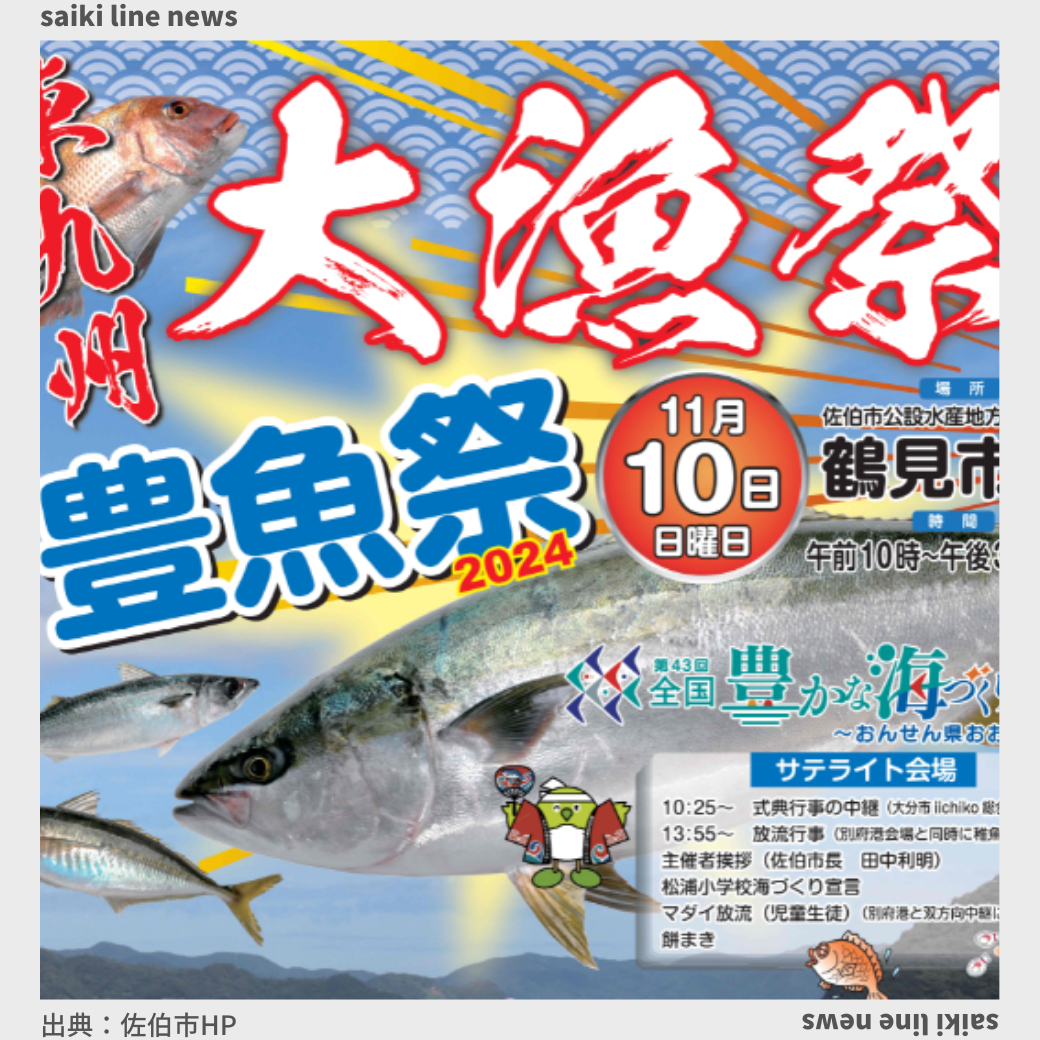 大分県下最大級の海の祭典が11月10日(日曜日)午前10時~午後3時30分 佐伯市鶴見市場で堂々開催! 東九州大漁祭&つるみ豊魚祭2024 第43回全国豊かな海づくり大会おんせん県おおいた大会サテライト会場 ■ステージ ... |