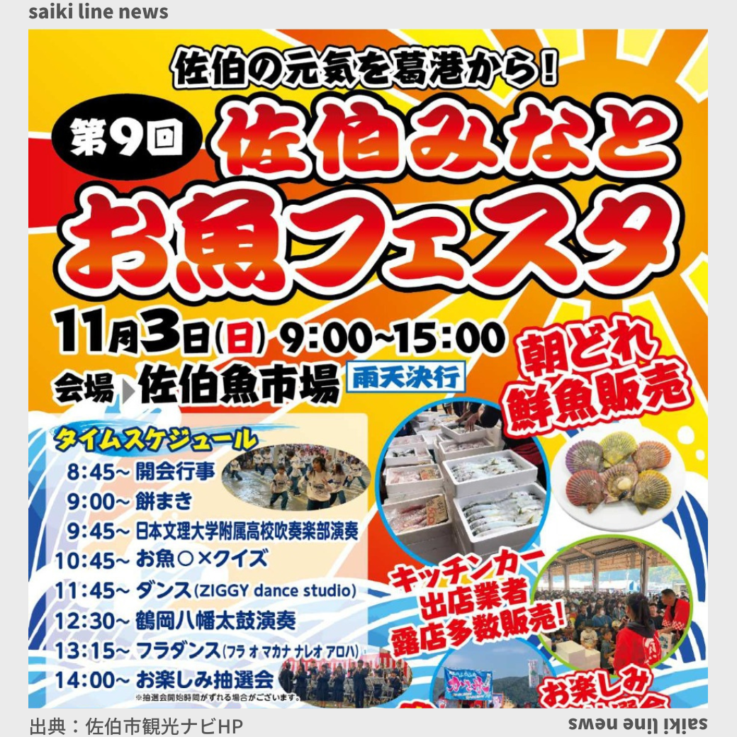 お魚くじ、餅まき、朝獲れ鮮魚・特産品販売(鮮魚、水産加工品、海鮮丼 等)、キッチンカー、佐伯のうまいもん屋台、ヒオウギ貝釣り、お魚すくい等港街を体感できる各種イベント(日本文理大学付属高校吹奏楽部の演奏やダンス 等) 「 ... |
