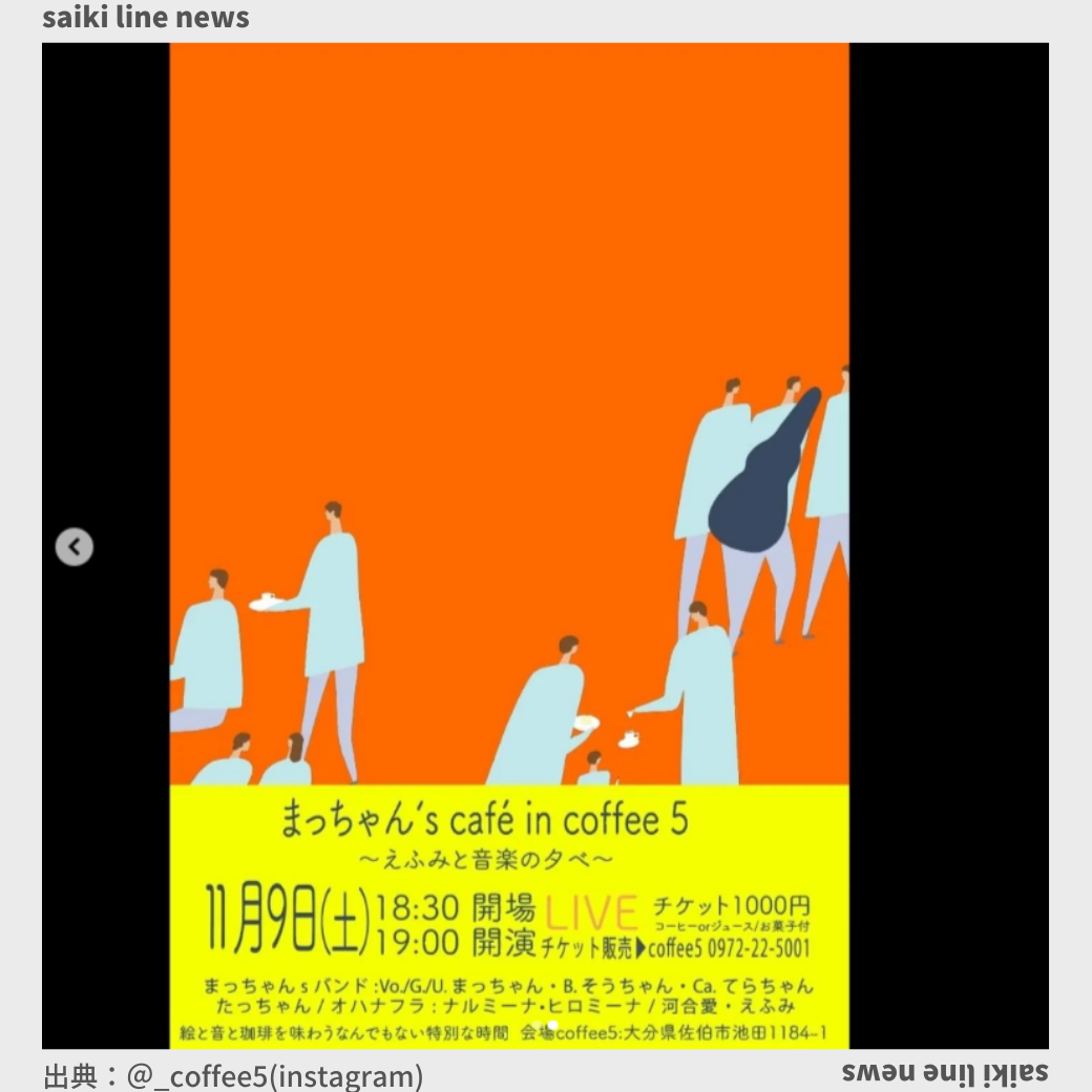 ●11月9日(土) まっちゃん’s cafe LIVE 開場 18:30 開演 19:00 料金 1,000円 (1ドリンク+お菓子付) ご予約 @_coffee5 |