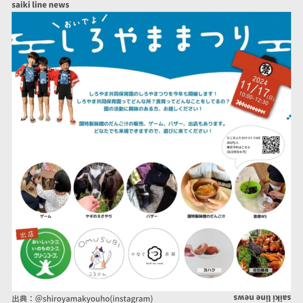 \第2回・しろやままつり開催/ 11/17(日)10:00〜12:30 しろやままつりを開催します✨ みなさん、ぜひ、遊びにいらして下さいね♪ そして、このしろやままつりでは園の食育を体験できるワークショップも開催されま ... |