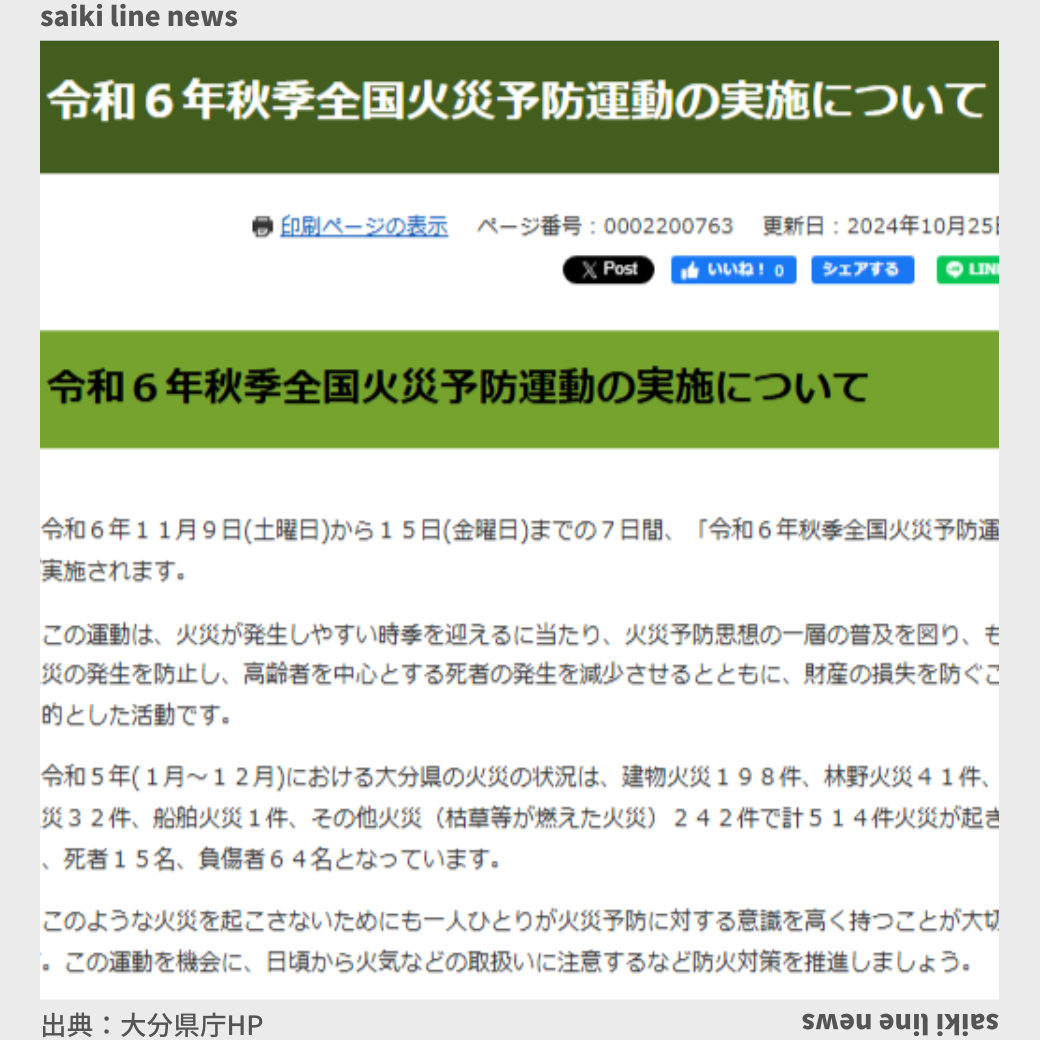 令和6年11月9日(土曜日)から15日(金曜日)までの7日間、「令和6年秋季全国火災予防運動」が実施されます。 この運動は、火災が発生しやすい時季を迎えるに当たり、火災予防思想の一層の普及を図り、もって火災の発生を防止し ...