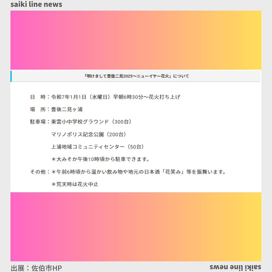 日 時:令和7年1月1日(水曜日)早朝6時30分~花火打ち上げ 場 所:豊後二見ヶ浦 駐車場:東雲小中学校グラウンド(300台) マリノポリス記念公園(200台) 上浦地域コミュニティセンター(50台) *大みそか ... |