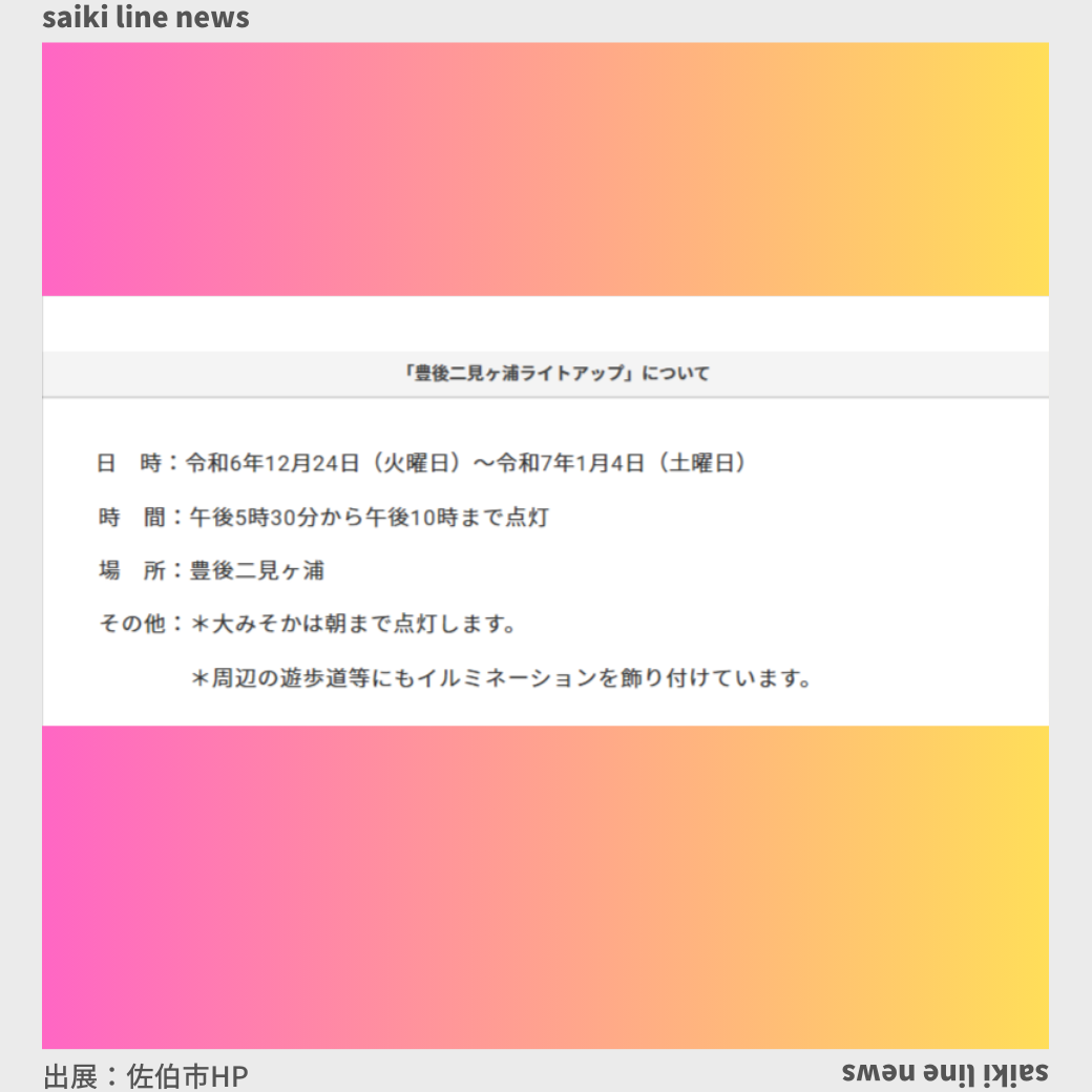 日 時:令和6年12月24日(火曜日)~令和7年1月4日(土曜日) 時 間:午後5時30分から午後10時まで点灯 場 所:豊後二見ヶ浦 その他:*大みそかは朝まで点灯します。 *周辺の遊歩道等にもイルミネーションを飾り ...
