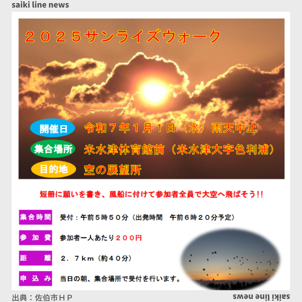 「サンライズウォーク」で初日の出を迎えませんか? 元旦に米水津で「サンライズウォーク」を開催します。 米水津湾を眼下に見下ろしながら、2.7kmの「豊後くろしおライン」を歩いて空の展望所を目指します。 短冊に願いを書いて ...