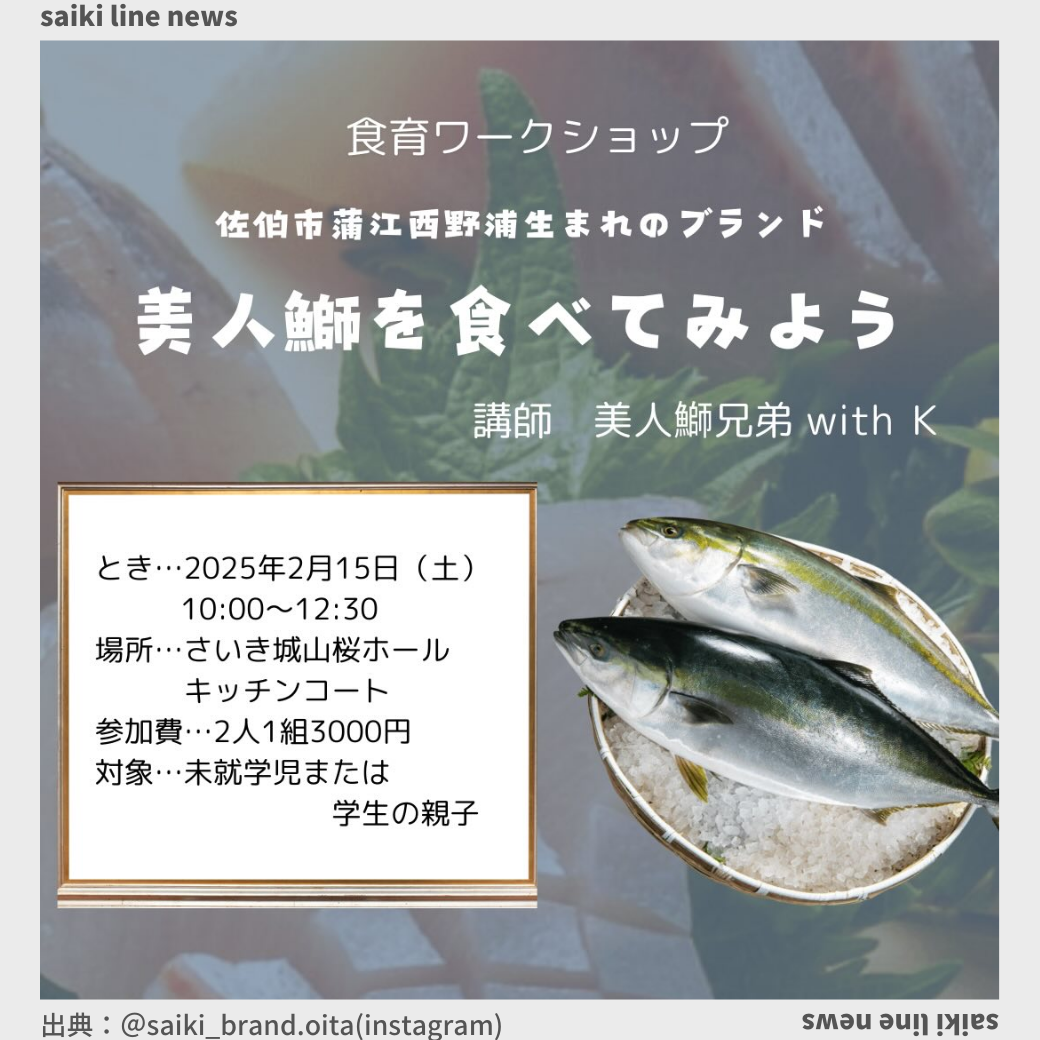2025年2月15日(土) 『西野浦から生まれたブランド美人鰤を食べてみよう』 時間…10:00〜12:30 場所…さいき城山桜ホールキッチンコートにて開催 講師…美人鰤兄弟 with K 参加費…2人1組3000円 対 ...