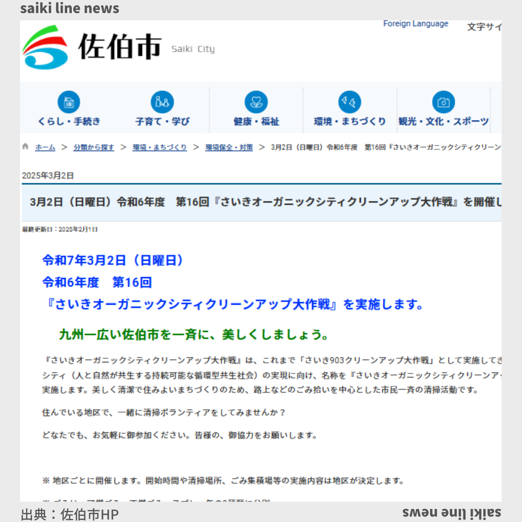 令和7年3月2日(日曜日) 令和6年度 第16回 『さいきオーガニックシティクリーンアップ大作戦』を実施します。 九州一広い佐伯市を一斉に、美しくしましょう。 『さいきオーガニックシティクリーンアップ大作戦』は、これまで ...