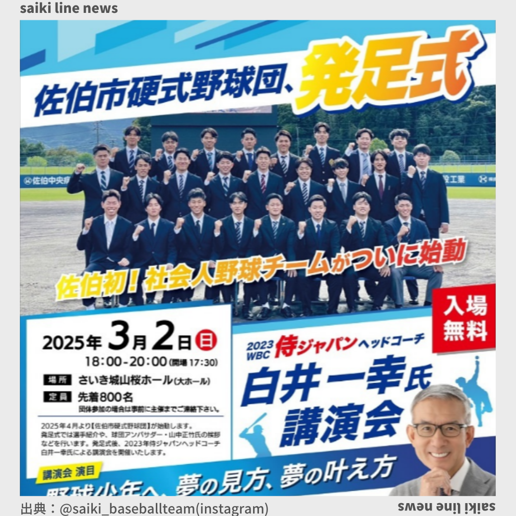 この度、当球団の発足式を開催することといたしました✨ 球団アドバイザーの山中正竹氏をはじめ、選手紹介を行います! さらに、2023年WBC侍ジャパンヘッドコーチの白井一幸氏による講演会を開催いたします! 佐伯市の皆様、野 ... |