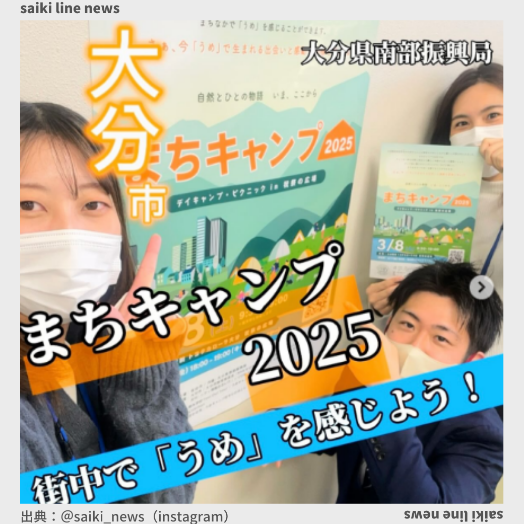 まちキャンプ2025の開催✨ 3月8日(土) 9時30分〜19時00分 大分市祝祭の広場が「うめ」になります! まちキャンプ2025では、街中でデイキャンプや ピクニック、クイズ大会、苗木の無料配布などが 楽しめます!! ... |