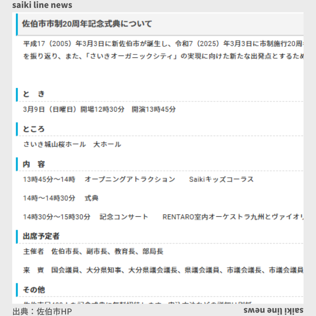 平成17(2005)年3月3日に新佐伯市が誕生し、令和7(2025)年3月3日に市制施行20周年を迎える。この節目の年を市民とともに祝い、これまでの歩みを振り返り、また、「さいきオーガニックシティ」の実現に向けた新たな出 ...