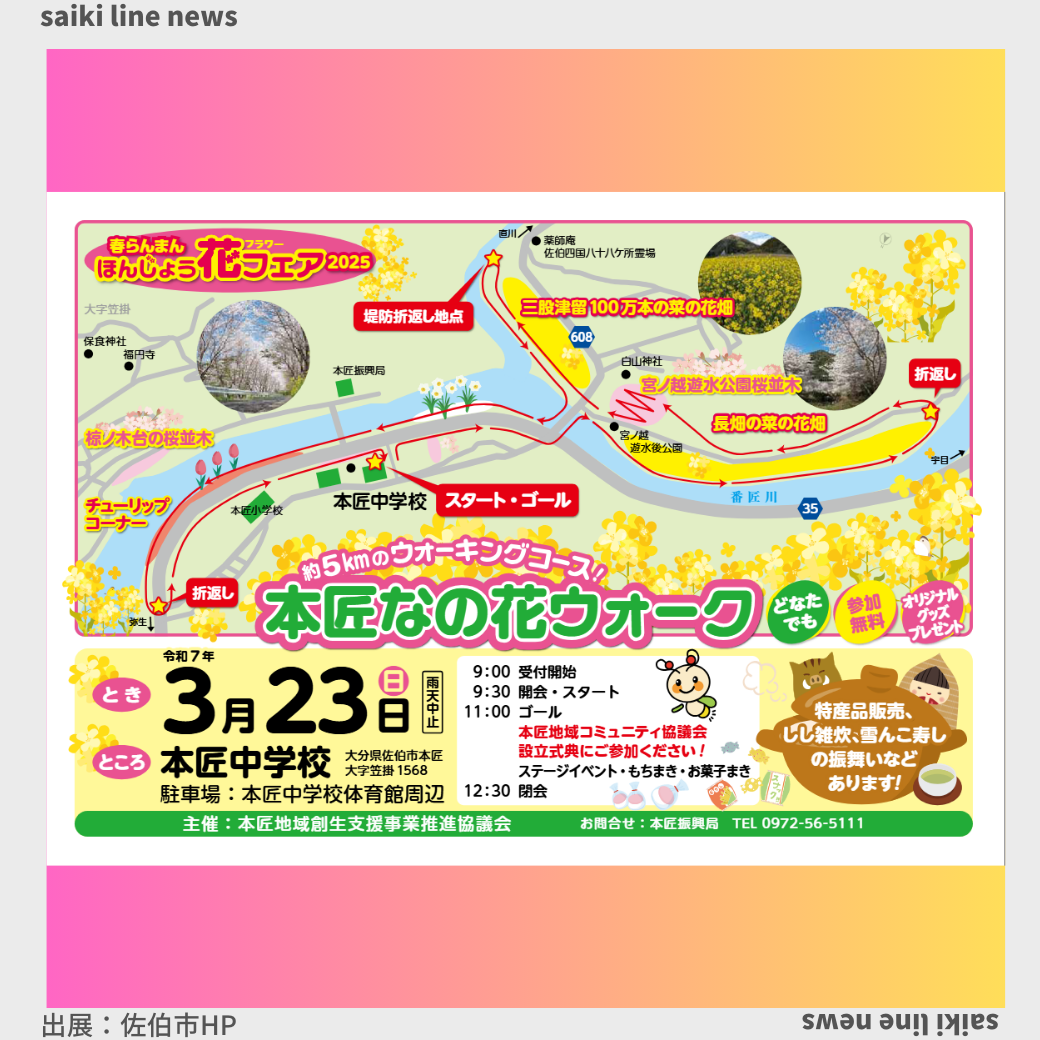 春らんまん ほんじょう花フェア2025 を開催します! 今年は「本匠なの花ウォーク」として、約5kmの特設ウォーキングコースを設けます。 ・日時:令和7年3月23日(日曜日) 受付開始:午前9時から ※雨天の場合は、ウォ ...