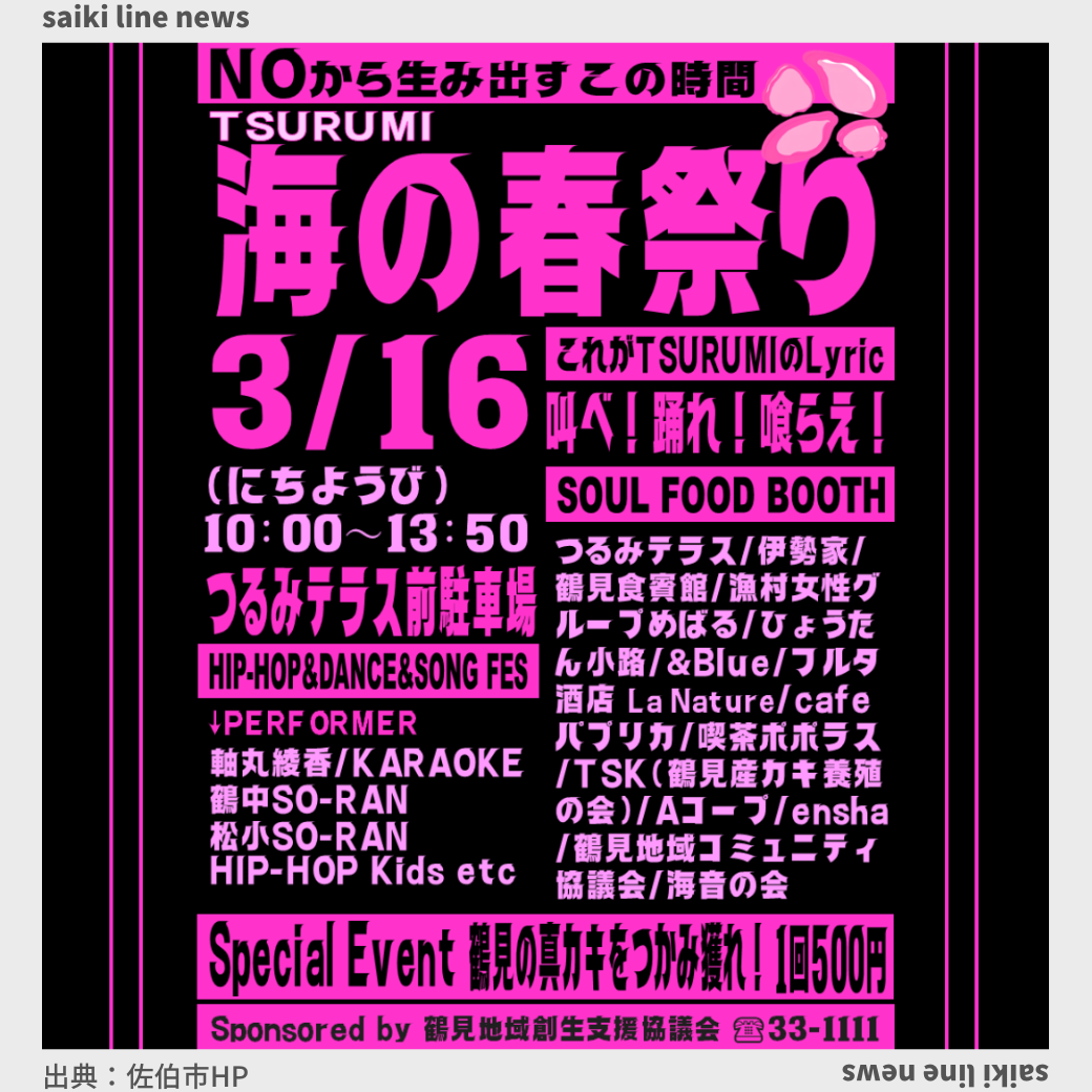 独創を極めるTSURUMIが贈る地域ファンフェス TSURUMI海の春祭り 今年は、3月16日(日曜日)10時00分~ つるみテラス前駐車場(あまべ商工会前)で開催されます。 TSURUMIの世界観に浸りに来ませんか! |