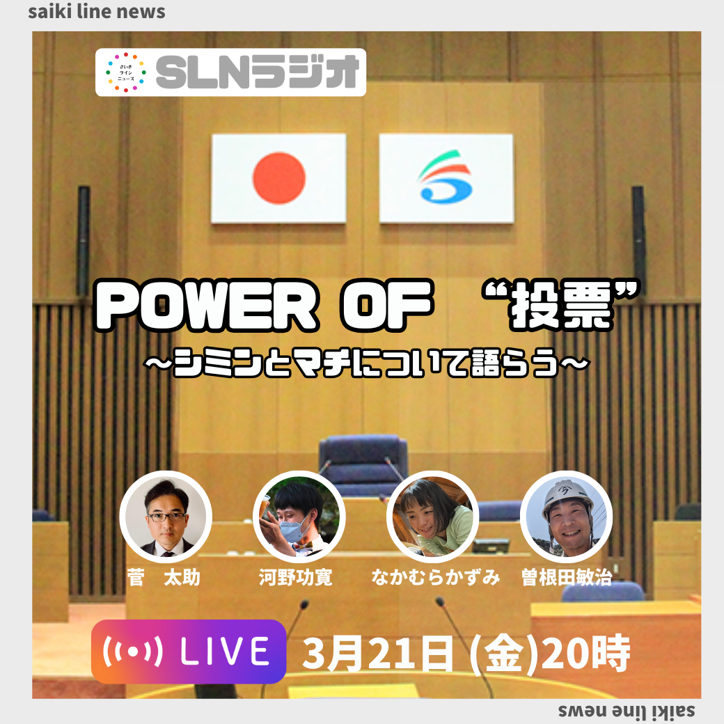 さいきラインニュースにて、インスタライブイベント(SLNラジオ)を行います。 テーマはPOWER OF "投票"。 日時:3月21日20時~ 約1時間ほどを想定してます。 佐伯市長選や市議会議員選挙も近いのでですね、特定 ... |