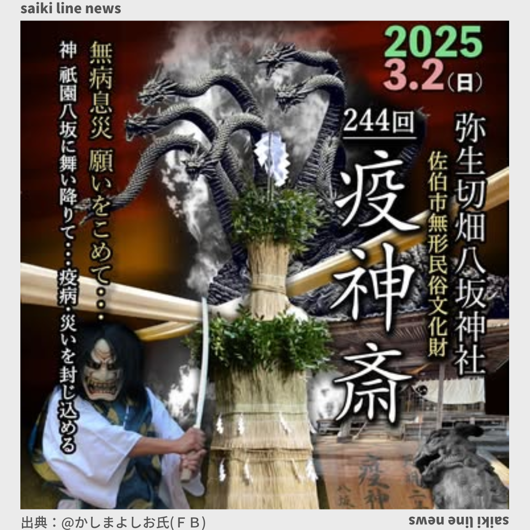 佐伯市無形民俗文化財 弥生祇園八坂神社 第244回疫神斎(やくしんさい) 天明2年佐伯藩で疫病が流行り、人のチカラではどうする事も出来ず、毛利の殿様が塚を作り疫病を封じ込めるよう通達。 神社では神事が執り行われ、スサノオ ...