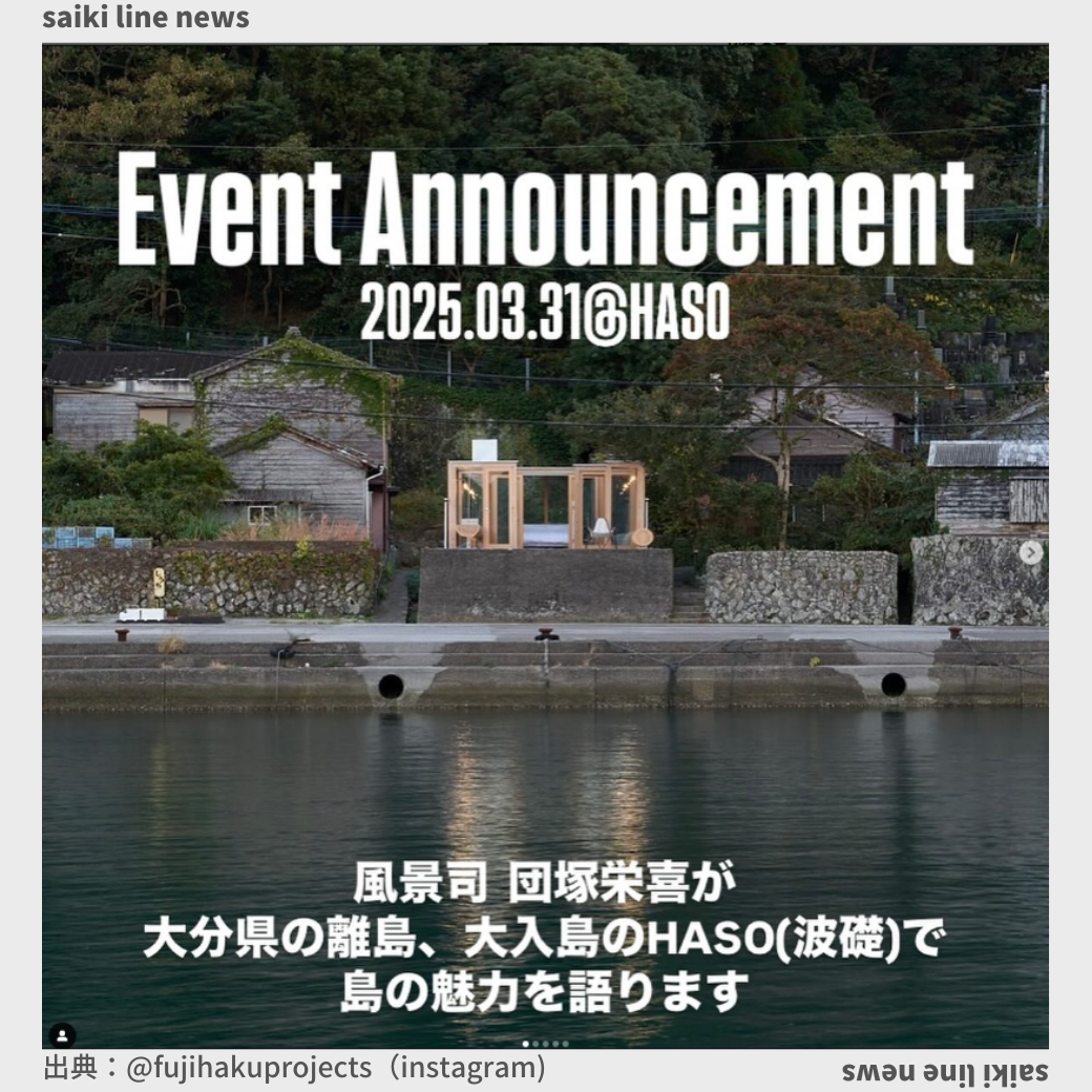 風景司 団塚栄喜が、生誕の地・大入島HASO(波礎)で「不時泊」のコンセプトと島の魅力を語ります 日時:3/31(月) 17:00~内覧会 18:00〜座談会 場所:HASO(波礎)大入島 塩内(大分県佐伯市) 参加費: ... |