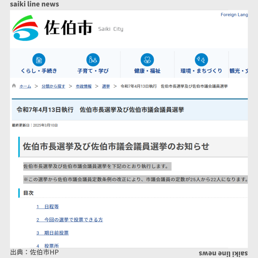 佐伯市長選挙及び佐伯市議会議員選挙を下記のとおり執行します。 ※この選挙から佐伯市議会議員定数条例の改正により、市議会議員の定数が25人から22人になります。