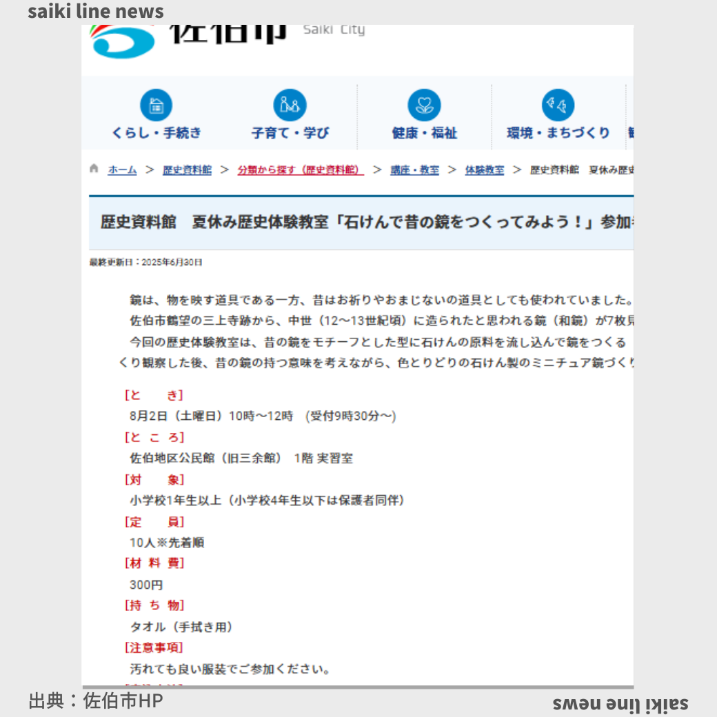 鏡は、物を映す道具である一方、昔はお祈りやおまじないの道具としても使われていました。 佐伯市鶴望の三上寺跡から、中世(12~13世紀頃)に造られたと思われる鏡(和鏡)が7枚見つかっています。 今回の歴史体験教室は、昔の鏡 ...