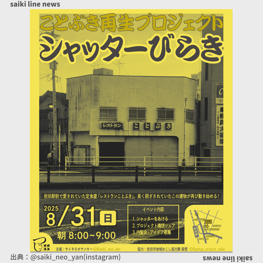 ことぶき再生プロジェクト 【シャッターびらき】 佐伯駅前で愛されていた定食屋「レストランことぶき」。長く閉ざされていたこの建物が再び動き始める! みんなで一緒にシャッターを開けて、空き家に新たな息吹を吹き込みましょう💪 ...
