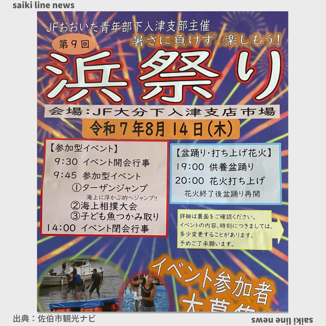 〇 9:30 イベント開会行事 〇 9:45 参加型イベント ① ターザンジャンプ 海上に浮かぶ的へジャンプ!! 〇 11:00 ② 海上相撲大会 中高生男子の部・女性の部・一般男子の部 * 参加人数制限なし 〇 13: ... |