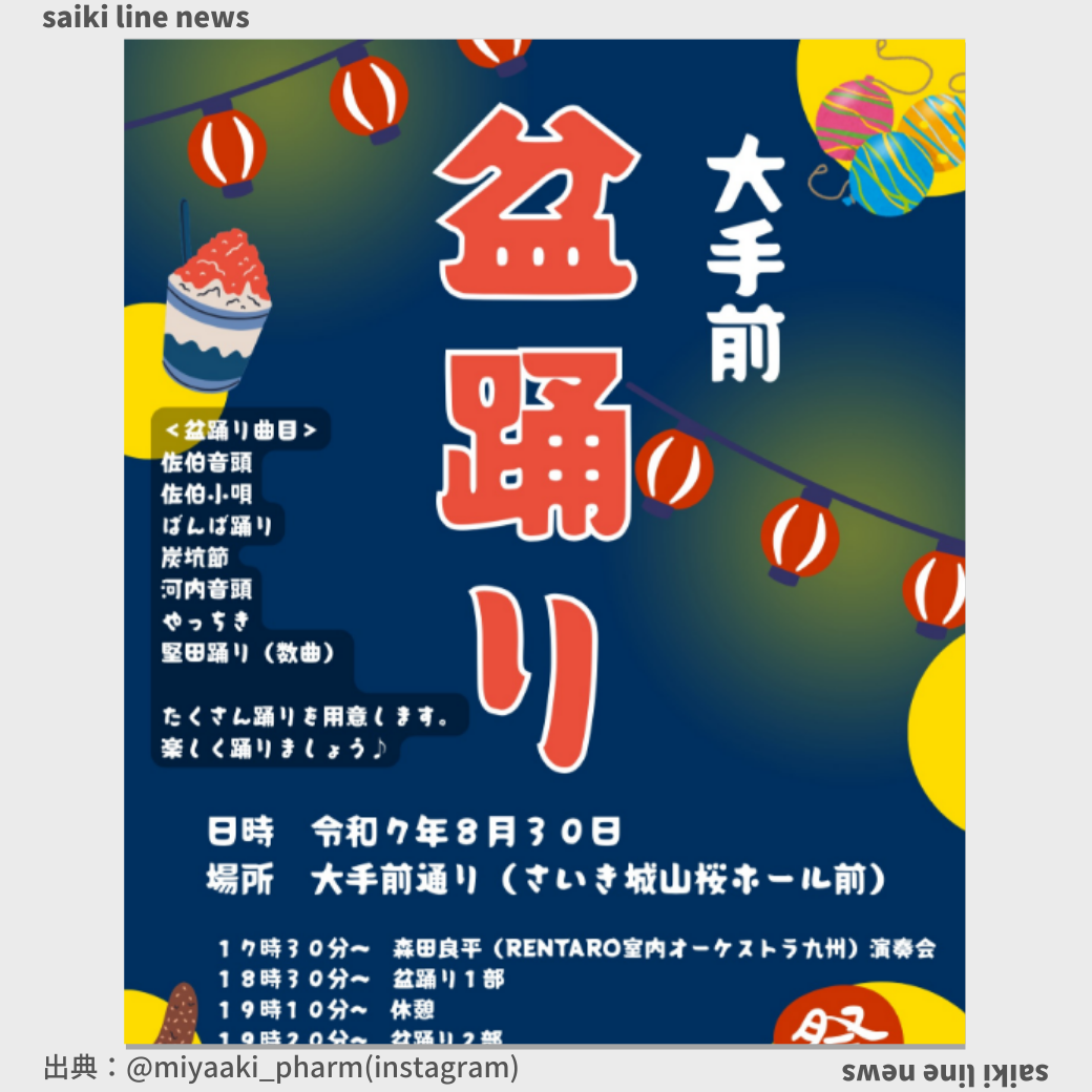 盆踊り大会します。 8/30㈯は大手前で盆踊り。 8月の最後を踊って締めくくりましょう! 桜ホール前の道路が一部ホコ天に なります。 曲数もバラエティーに富んだ内容 ですので、ぜひ踊りに来てください! お菓子撒きもしま~ ...