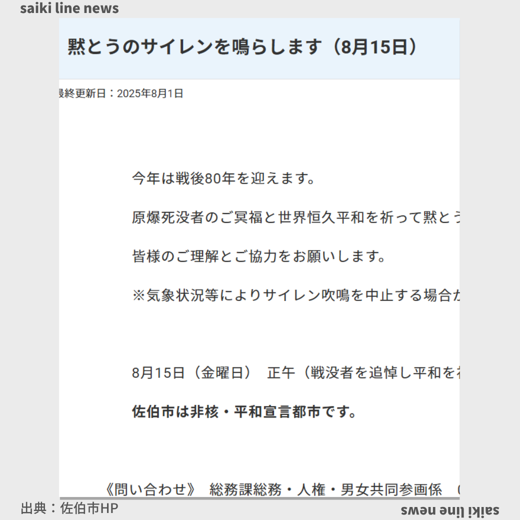 今年は戦後80年を迎えます。 原爆死没者のご冥福と世界恒久平和を祈って黙とうを行うため、次のとおりサイレンを1分間鳴らします。 皆様のご理解とご協力をお願いします。 ※気象状況等によりサイレン吹鳴を中止する場合がありま ... |