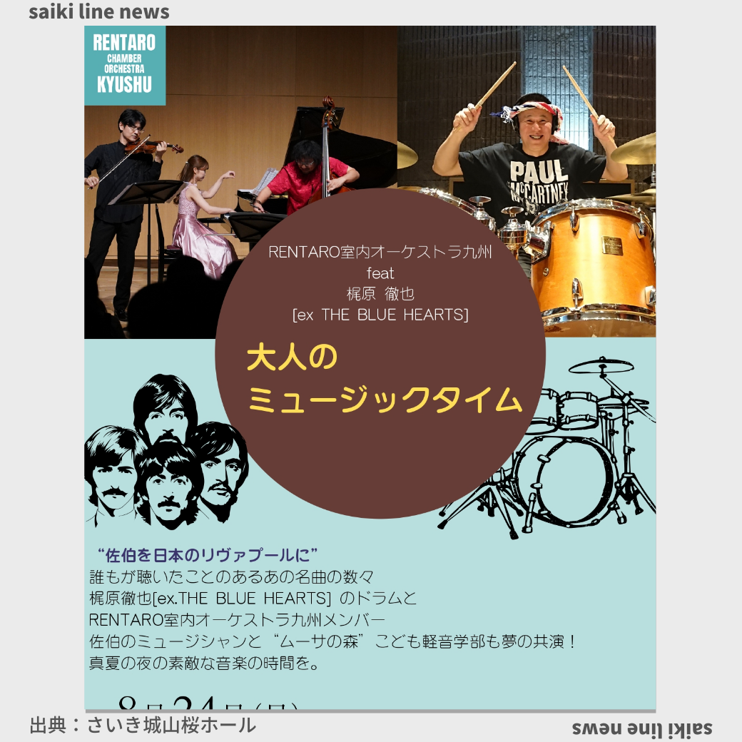 誰もが聴いたことのあるあの名曲の数々 梶原徹也(ex THE BLUE HEARTS)のドラムとRENTARO室内オーケストラ九州メンバー、佐伯のミュージシャンと“ムーサの森”こども軽音楽部も夢の共演! 真夏の夜の素敵な ... |