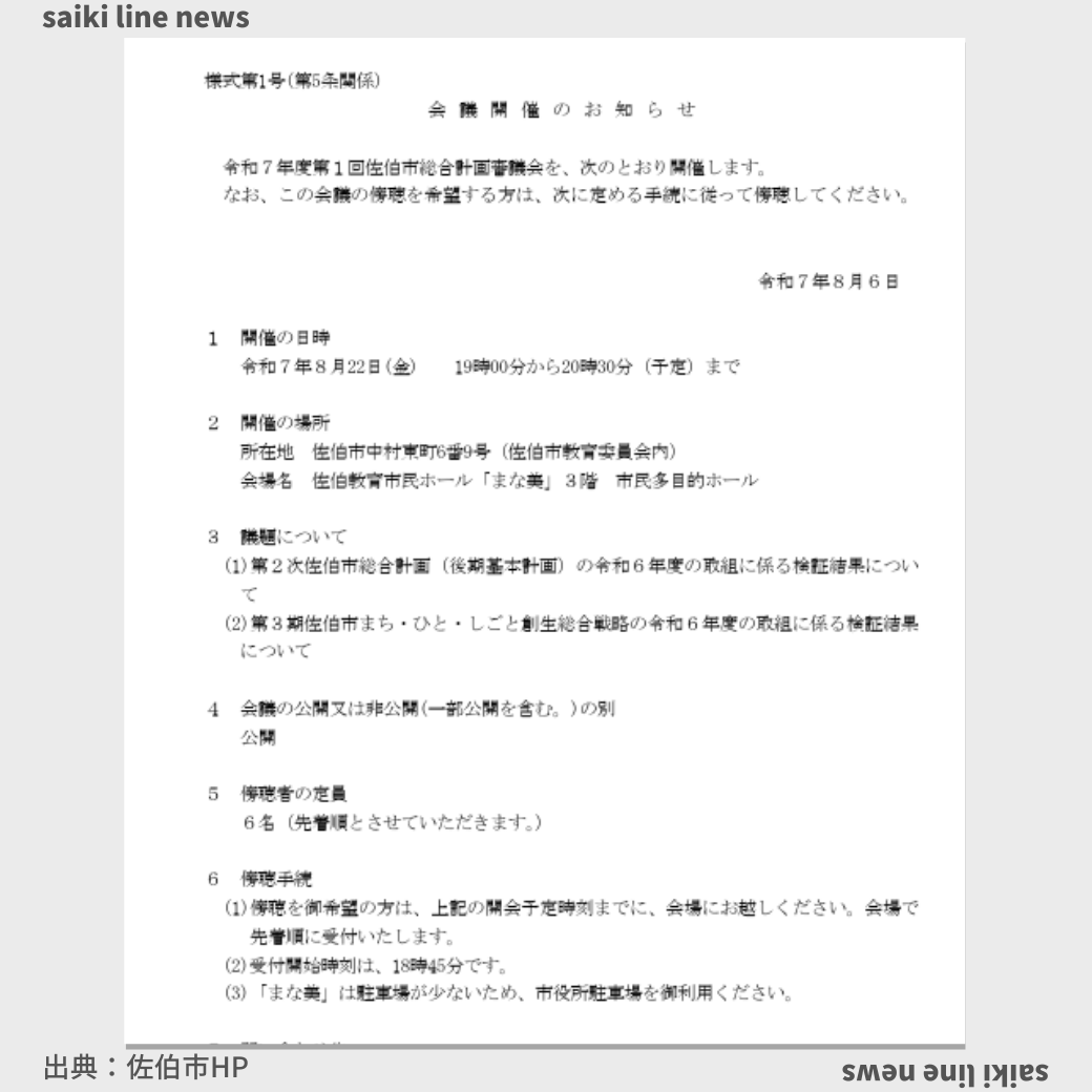 令和7年度第1回佐伯市総合計画審議会を、次のとおり開催します。 なお、この会議の傍聴を希望する方は、次に定める手続に従って傍聴してください。 |