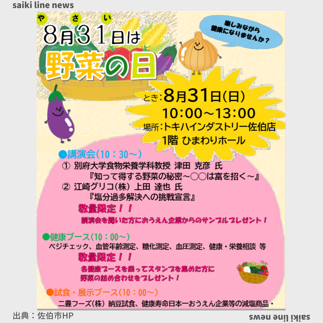 8月31日は野菜(831)の日です🥬 野菜の日にかけて、8月31日(日曜日)10時からトキハインダストリー佐伯店で「野菜の日のイベント」を開催します。 当日は、講演会や健康ブース、試食、お子さま向けブース等、楽しみながら ... |