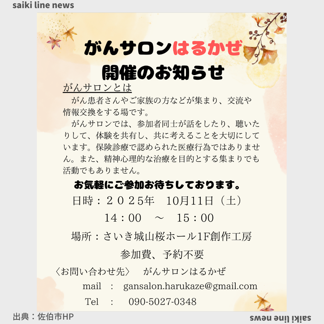 がんサロンはるかぜが開催されます。 がんサロンとは、がん患者さんやご家族の方などが集まり、交流や情報交換をする場です。 参加者同士が話をしたり聴いたりして体験を共有し、共に考えることを大切にしています。 ぜひ、お気軽にご ...