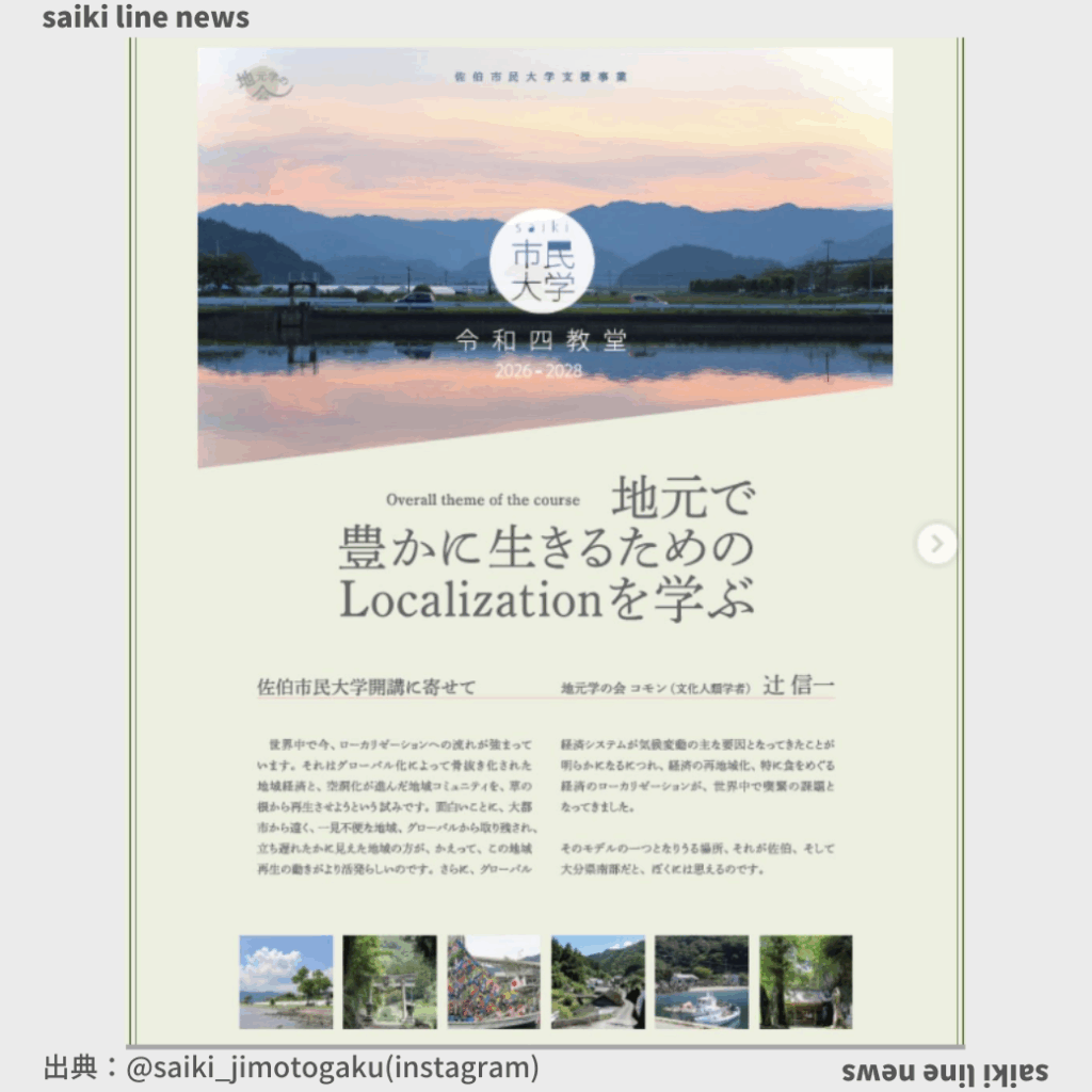 この運営講座は約2年半に渡るプログラムです。令和8年から始まる前期講座では、全国区で活躍する著名な講師に来ていただく講座に加えて、専門性を同じくする佐伯近隣の実践者との対談を踏まえてLocalizationの全体像を掴む座学学習プログラムを御用意します(6講座、11名の講師を予定)。